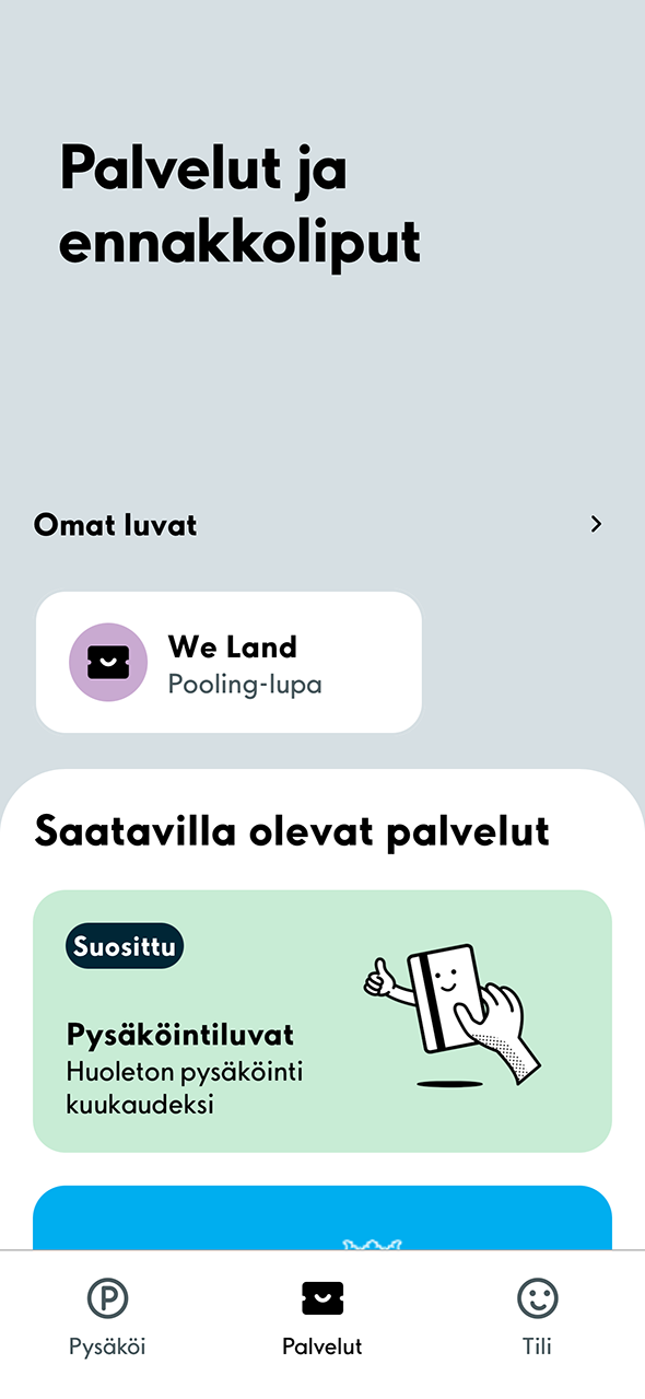 1. Valitse ensin alhaalta Palvelut -välilehti nähdäksesi omat lupasi. Valitse sitten Omat luvat -kohdan alta Pooling-lupa.