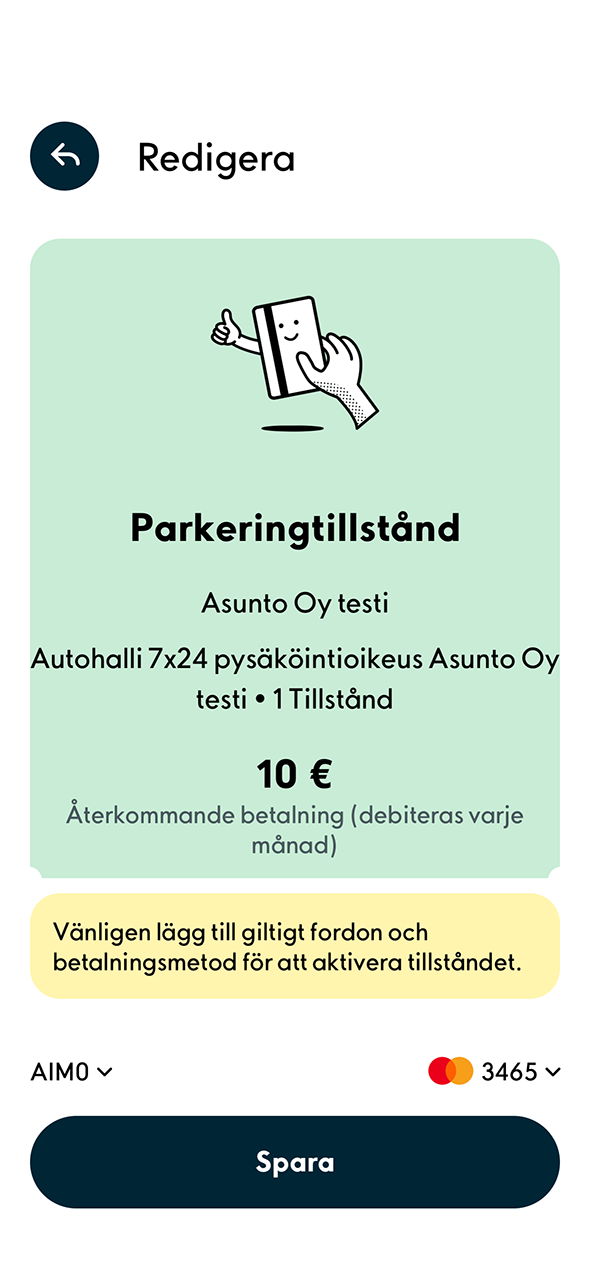 3. Välj fordon och betalkort. Välj därefter Spara.