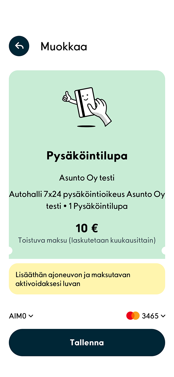 3. Valitse ajoneuvo ja maksukortti. Sen jälkeen valitse Tallenna.