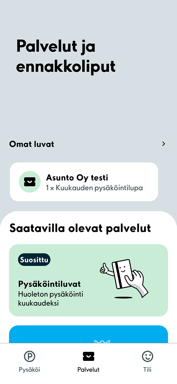 1. Voimassa olevat lupasi näkyvät ostotapahtuman jälkeen Palvelut -välilehdellä. Jos haluat tehdä muutoksia ostamaasi lupaan, valitse lupa Omat luvat -osiosta.