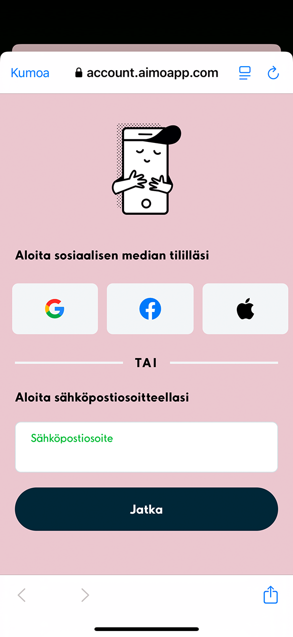 2. Jos haluat rekisteröityä Aimo sovellukseen käyttämällä Apple-, Facebook- tai Google-tunnuksia, valitse haluamasi vaihtoehto. Jos haluat rekisteröityä ilman Apple-, Facebook- tai Google-tunnuksia, aloita syöttämällä sähköpostiosoitteesi ja paina Jatka.